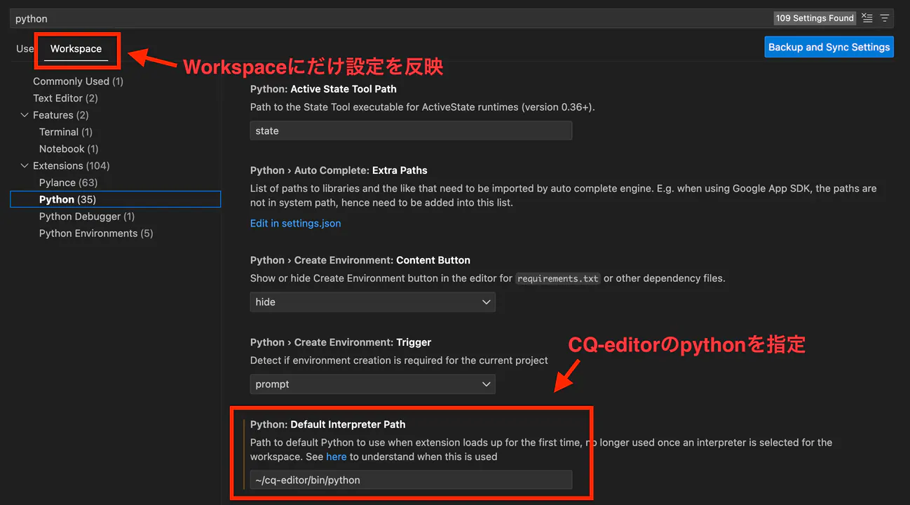 そこで、VSCodeの設定からpythonインタプリタのパスを~/cq-editor内のものに変更しておきましょう。とはいえ、PC全体でここの設定を変えちゃうとCadQueryじゃない普通のPythonコード書くときに不都合があるので、設定変更をWorkspaceに限定しておくのがいいでしょう。