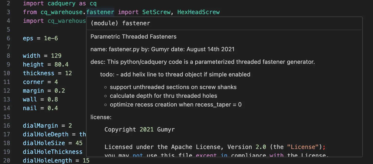 ただ、そのままだとVSCodeのPython LSPがCQ-editorのPython環境ではなく、普通にインストールされている通常のPython環境を参照するため、CQ-editor側に入れたライブラリとかのコード補完が効きません。